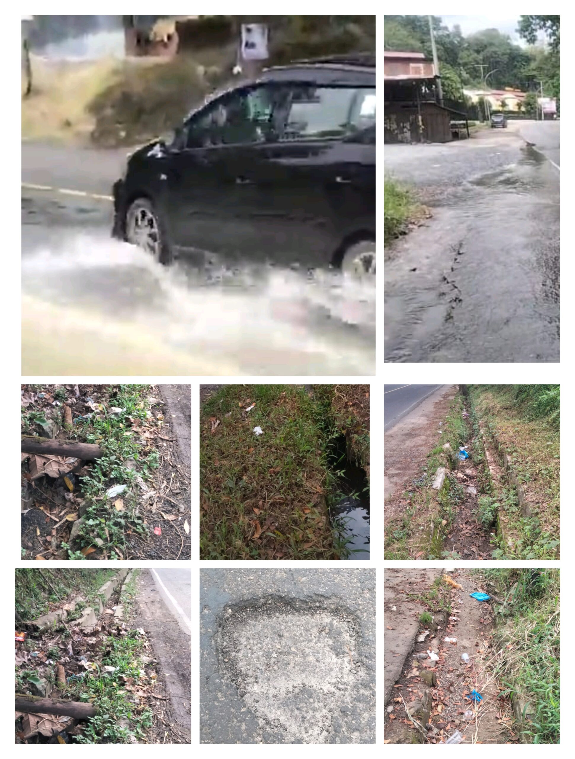 Saluran yang tersumbat oleh tanah dan rumput menyebabkan saluran air tidak berfungsi dengan baik, sehingga air mengalir ke bahu dan badan jalan. “Persis di depan bengkel, kecelakaan sering terjadi karena pengendara menghindari genangan air di badan jalan,” kata seorang warga. Kondisi jalan semakin licin saat hujan, dengan debit air yang deras mengikis material bahu jalan dan menyebabkan lubang yang membahayakan.