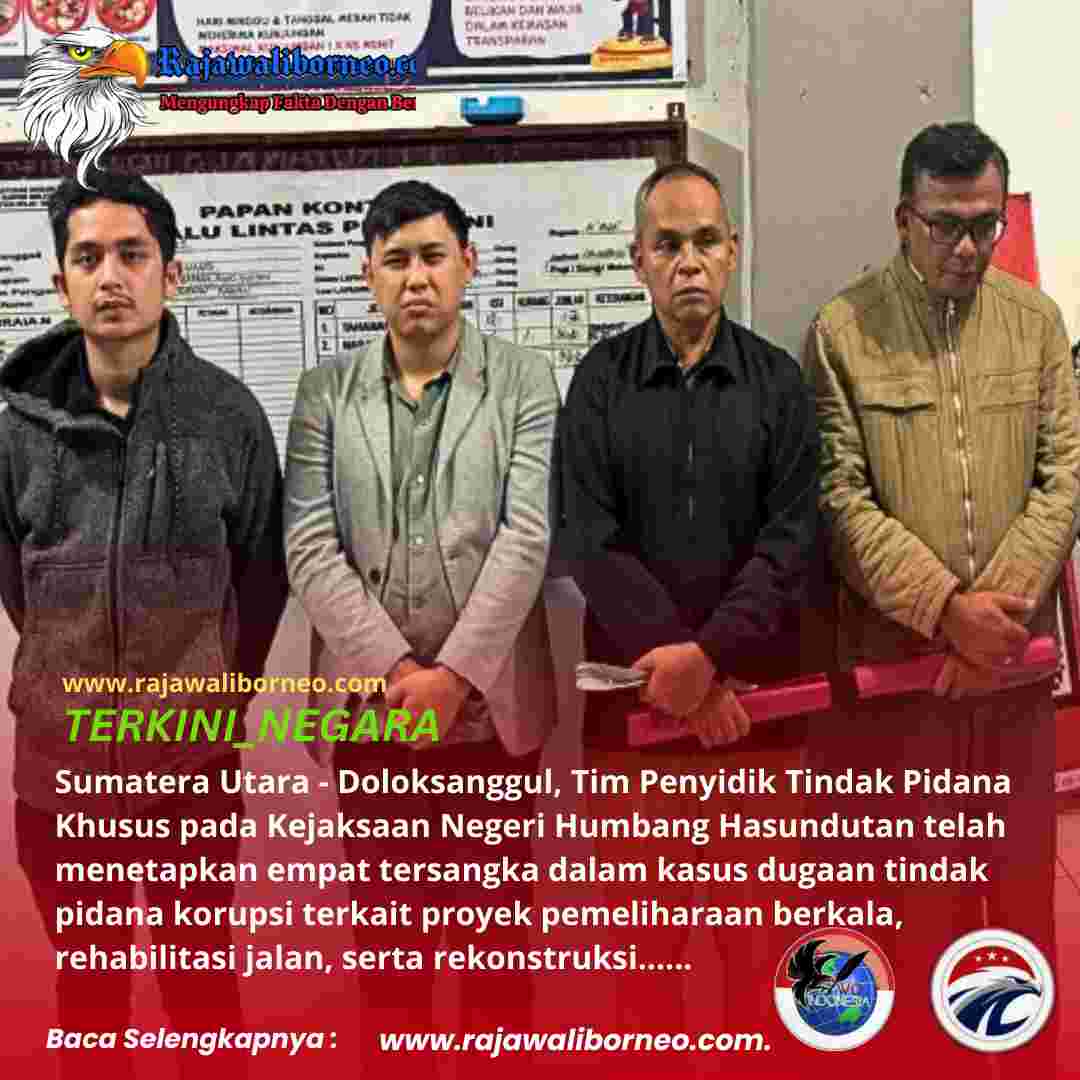 Rajawaliborneo.com. Sumatera Utara – Doloksanggul, Tim Penyidik Tindak Pidana Khusus pada Kejaksaan Negeri Humbang Hasundutan telah menetapkan empat tersangka dalam kasus dugaan tindak pidana korupsi terkait proyek pemeliharaan berkala, rehabilitasi jalan, serta rekonstruksi atau peningkatan kapasitas struktur Jalan Parbotihan – Pulo Godang – Temba Tahun Anggaran 2022 pada Dinas Pekerjaan Umum dan Tata Ruang (PUTR) Kabupaten Humbang Hasundutan. Senin, 10 Maret 2025.