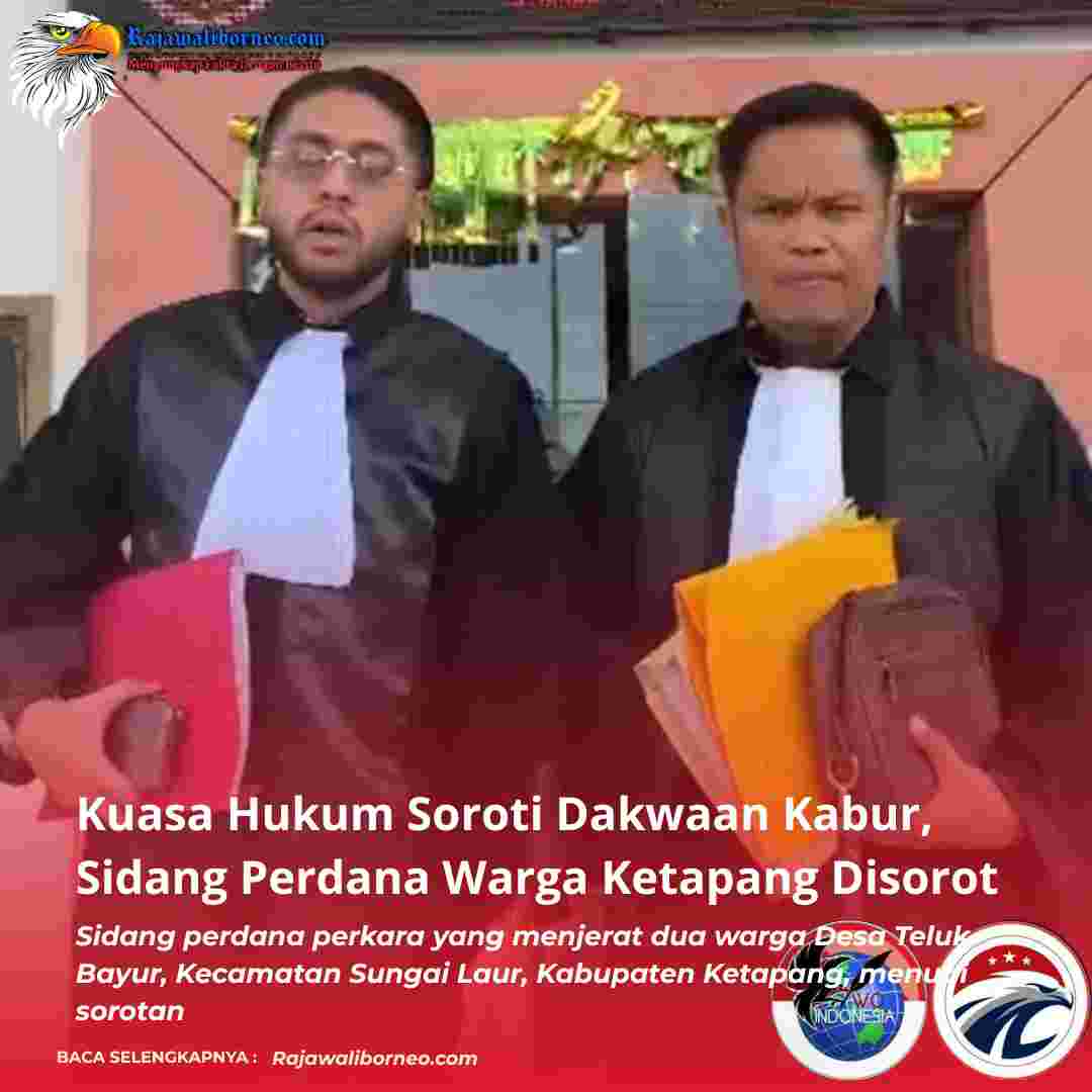 RAJAWALIBORNEO.COM. Ketapang, Kalimantan Barat – Sidang perdana perkara yang menjerat dua warga Desa Teluk Bayur, Kecamatan Sungai Laur, Kabupaten Ketapang, menuai sorotan. Tim kuasa hukum menilai dakwaan jaksa tidak jelas dan berpotensi cacat formil.