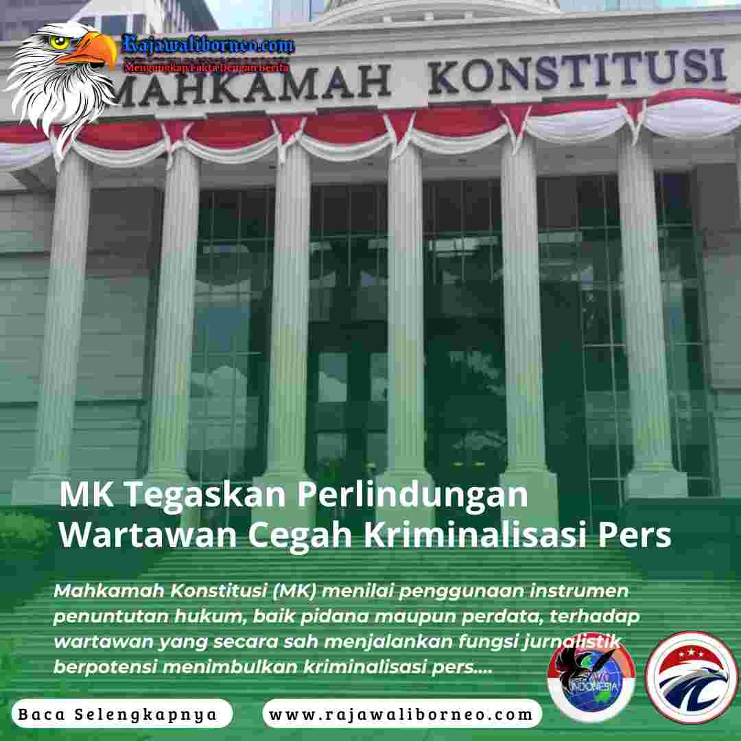 RAJAWALIBORNEO.COM.         Jakarta – Mahkamah Konstitusi (MK) menilai penggunaan instrumen penuntutan hukum, baik pidana maupun perdata, terhadap wartawan yang secara sah menjalankan fungsi jurnalistik berpotensi menimbulkan kriminalisasi pers. Kondisi tersebut dinilai dapat membungkam kritik, membatasi arus informasi, serta menekan kebebasan berekspresi dalam kehidupan demokrasi.