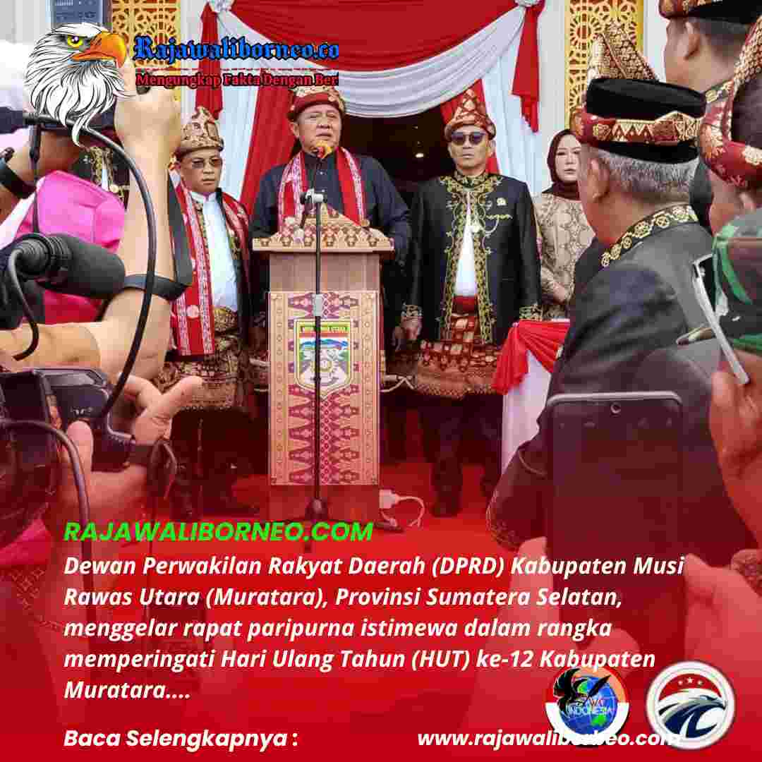 Rajawaliborneo.com. Muratara, Sumatera Selatan – Dewan Perwakilan Rakyat Daerah (DPRD) Kabupaten Musi Rawas Utara (Muratara), Provinsi Sumatera Selatan, menggelar rapat paripurna istimewa dalam rangka memperingati Hari Ulang Tahun (HUT) ke-12 Kabupaten Muratara, Senin (23/06/2025).