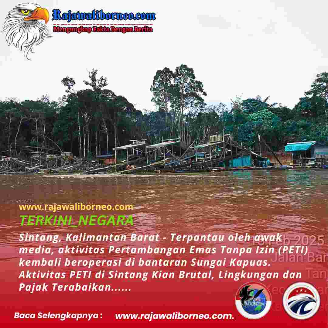 Rajawaliborneo.com. Sintang, Kalimantan Barat – Terpantau oleh awak media, aktivitas Pertambangan Emas Tanpa Izin (PETI) kembali beroperasi di bantaran Sungai Kapuas, tepatnya di wilayah Sungai Ana, Kelurahan Kecamatan Sintang, Kabupaten Sintang, Provinsi Kalimantan Barat, Rabu (16/04/2025).